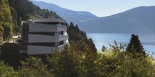 Sunnily-named Sonnenhof Dellach in Millstatt am See is a four-storey building. The above-ground levels are particularly striking: the three storeys are offset against each other to form the central element of this masterpiece of architecture and construction.
